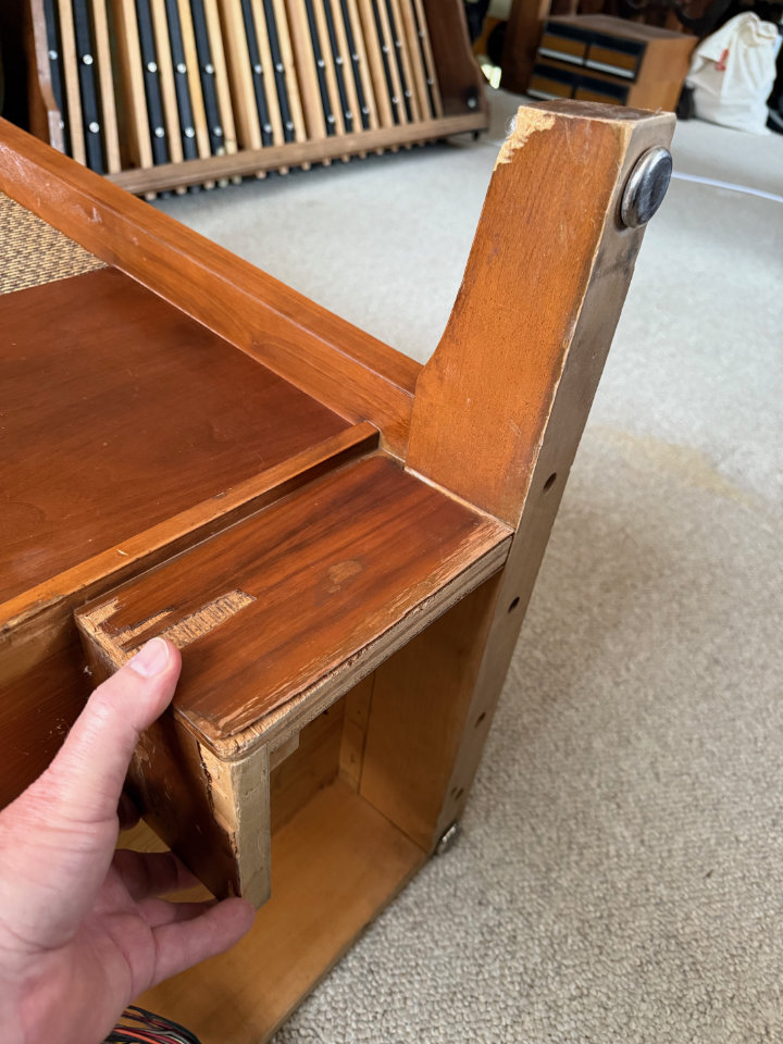 After flipping the console back to its upright position, we slid the pedals toward the console. Some trim on the front of the console was interfering with the “smiling” upper part of the pedal set. AGO pedals are curved, and the upswept ends where they meet the console look like a smile. Those pieces would have to be cut out, and a Japanese pull saw and wood chisel made short work of that.