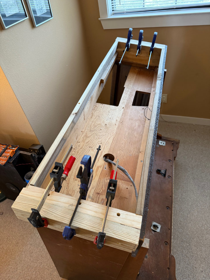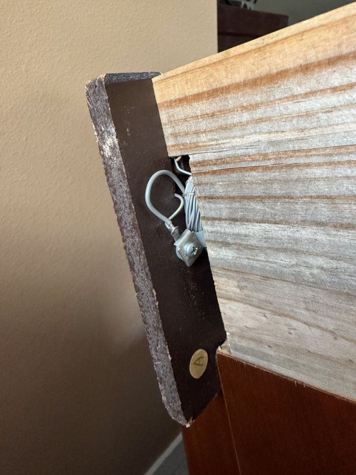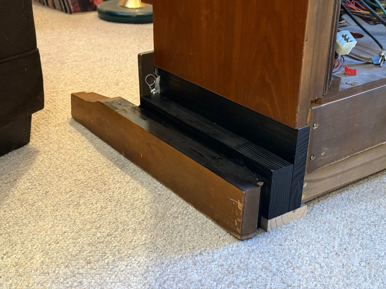 Once the foot extensions were in place. I could see a mounting strategy for the reed switch board. Made of some kind of painted particle board, it had been damaged in either removal or shipment, with a crack from top to bottom on one side. For strength it would need to be supported on all four sides. Adding a furring strip on the bottom of the console aligned with the front edge of the added extensions would provide support on at least three sides. Good enough for now.