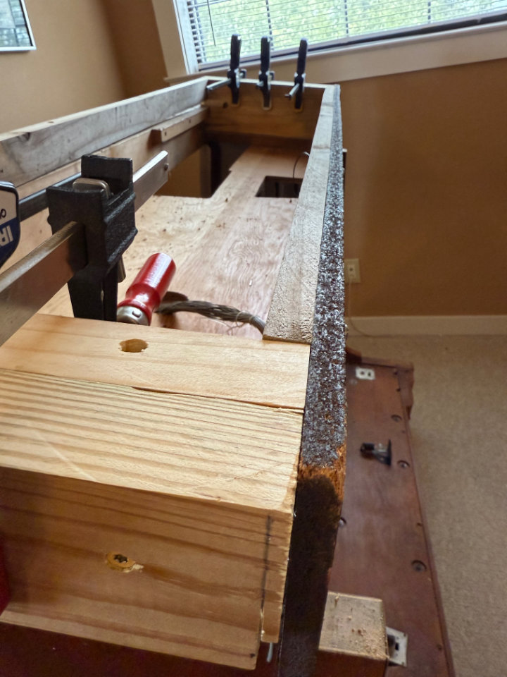 The original console feet were then attached to the outside of that using more glue and screws. The only difference is the console feet extended down an extra 3/4-inch to set the final console height and relationship to the pedals. I also added 3/4-inch boards below the extensions to fill in the space on the bottom and provide support should the outrigger feet fail.